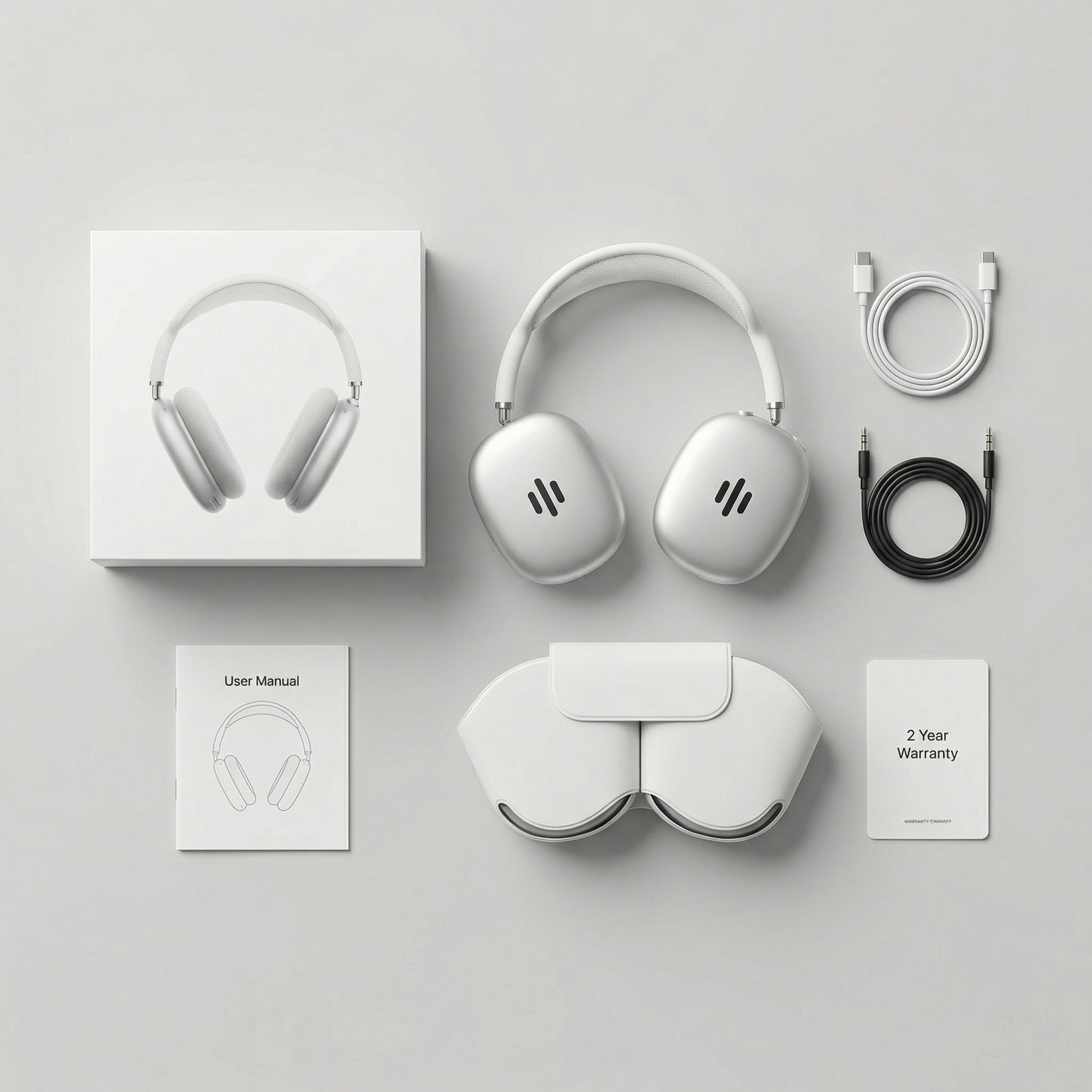 Headphones, a USB-C charging cable, a 3.5mm Audio Cable, a protective case and a 2-year warranty.